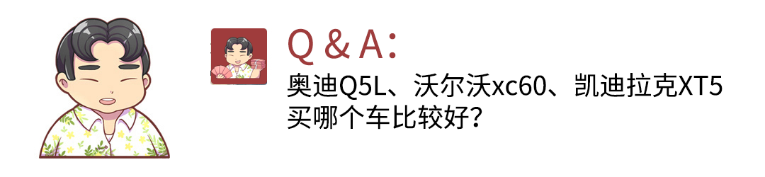 从品牌、性价比、销量来看,预算充足情况下,选择奥迪Q5L无疑是最合理,而且奥迪Q5L的空间最大,操控性更好,全系还标配quattro ultra适时四驱,整体行驶质感更加。但如果预算不够,想要更具性价比的,那就选择凯更便宜的迪拉克XT5,优势在于全系搭载2.0T发动机,不分高低功率,而且配置最为丰富,乘坐舒适性和NVH方面表现出色。当然注重于安全性能和环保的,那就选择沃尔沃XC60。