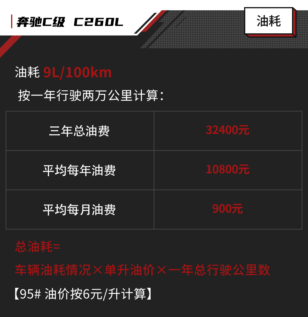 价格方面,奔驰C260L小保费用为930左右,大保费用为2500左右,而6万公里的大保金额高达6194元,这样算下来三年6次保养总费用是14697元。除了正常的保养,还有加油的钱,按每年两万公里来计算,奔驰C260车型综合油耗在9L/100km,结合95号汽油6元/L的单价,得出3年总油费为32400元,综合算下来每年保养+加油为15699元左右。