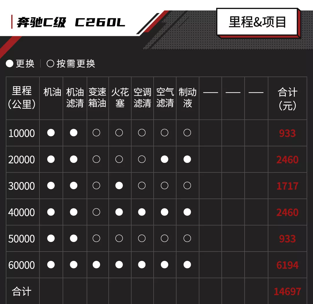 很多人担心奔驰C级的后期养车成本,我们就来简单算一算,根据官方推荐保养项目来看,奔驰C级遵循小保+大保的规律,间隔为1万公里/次,三年时间则需要保养6次。其中小保为机油+机油滤芯,另外每3万公里需要更换火花塞。大保则在此基础上增加空调、空气滤清器等,并且每2万公里需更换一次制动液(刹车油),而到了6万公里更是需要进行全面的保养。