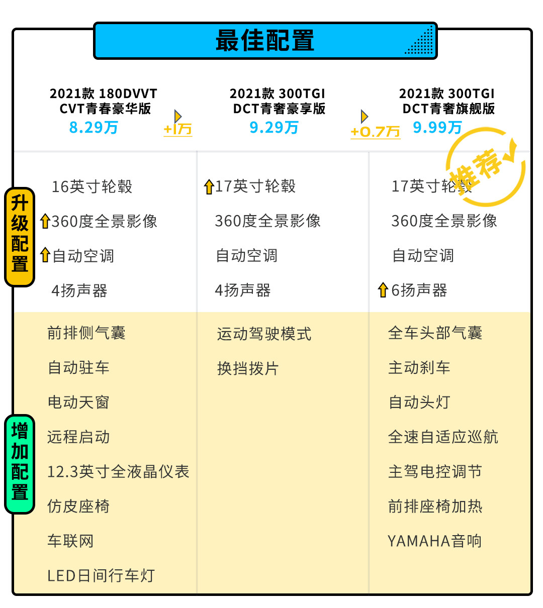 作为顶配车型旗舰版相较豪享版仅贵7000元,但却加入了自适应巡航、YAMAHA音响、电控座椅等非常多实用配置,加上其9.99万的售价也并不算高,后期应该还会有一定终端优惠的加持,因此是7个款式中是最值得购买的版本。