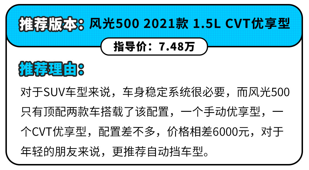 风光500是东风风光于近日推出的全新车型,5.48万的起售价是目前家族最便宜的SUV,而为了“减轻”年轻消费者的购车压力,东风风光还为前1万名用户提供了5000元的购车基金,也就是新车的起售价只要4.98万元。