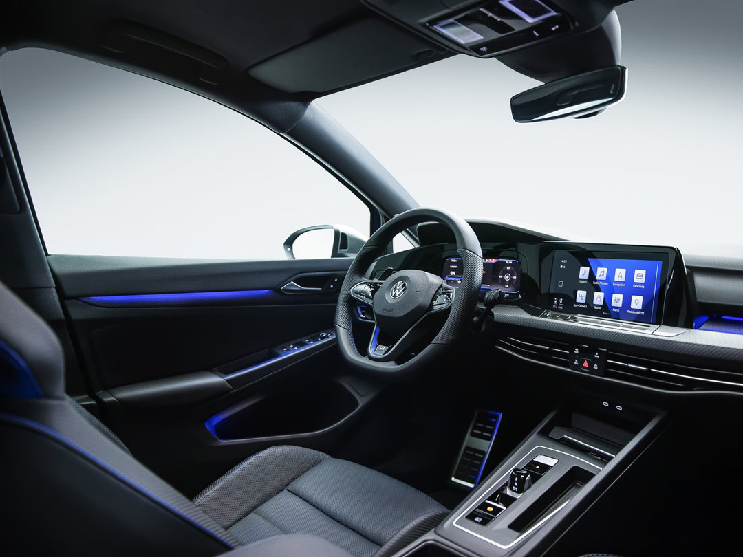 中控台跟第八代普通高尔夫基本保持一致,悬浮式的中央显示屏跟仪表盘相邻,在相对紧凑的车厢内能够有一种不错的视觉、使用体验。为了体现出高尔夫R的尊贵感,氛围灯、中央显示屏的UI都可以调节成蓝色,增强车辆的专属感。