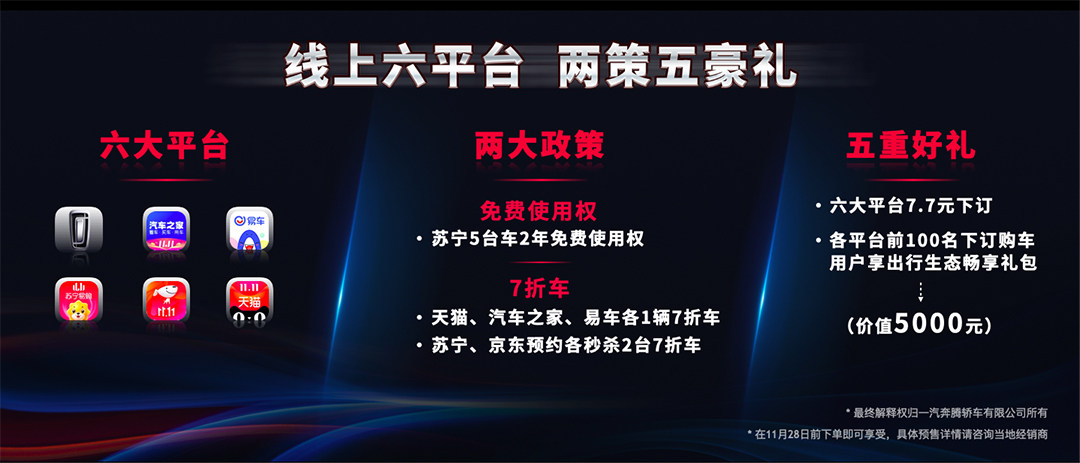 线下政策丰富,线上政策同样贴心。用户通过奔腾官网、汽车之家、易车、苏宁、京东、天猫等六大平台下单,不止有机会抽到7折车的权益,更有望将出行生态畅享礼包带回家。此外,在北京卫视《苏宁易购1111超级秀》上,奔腾还将抽出5台B70的 2年免费使用权。如此给力的预售政策,堪称今年“双十一”的硬核玩家。