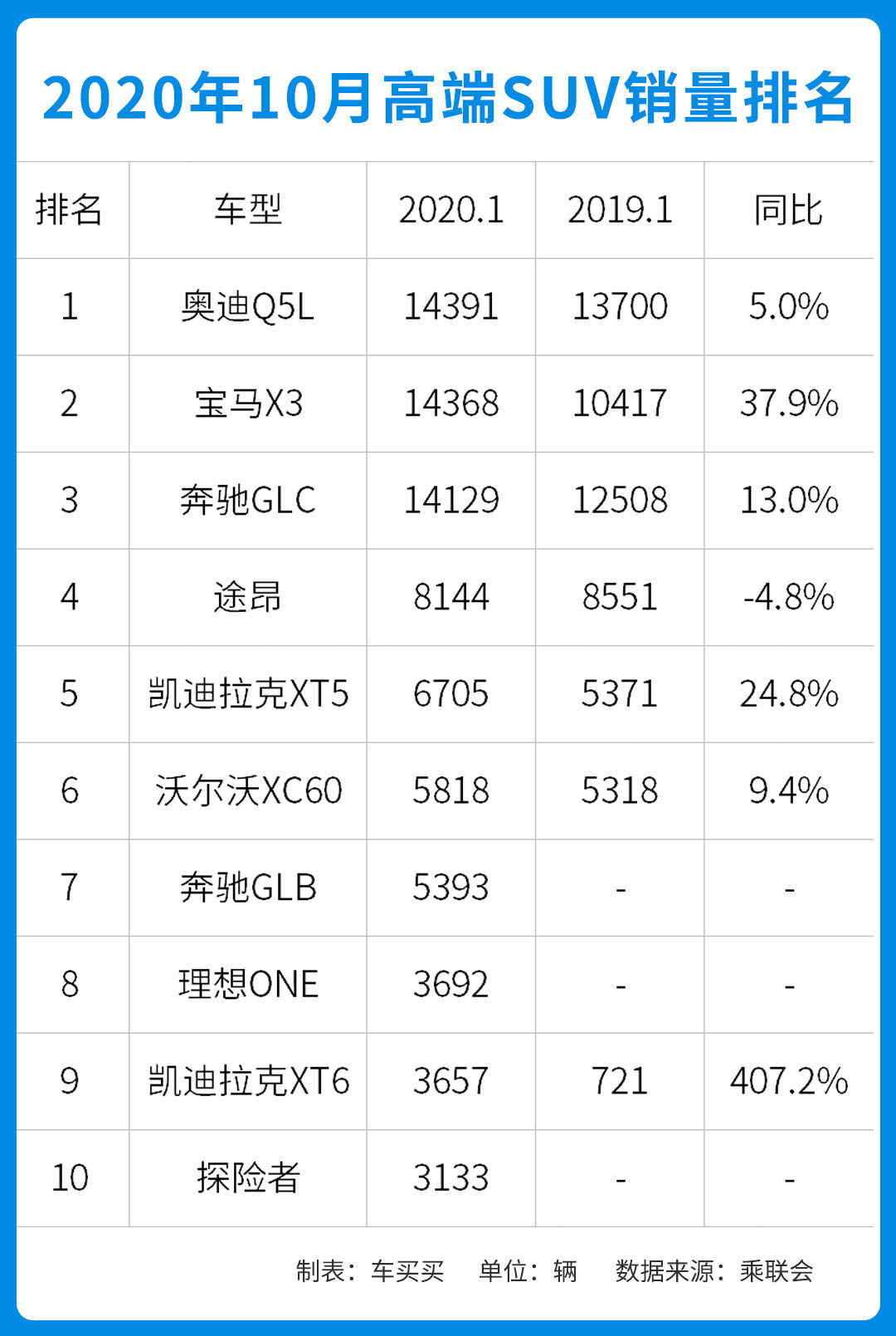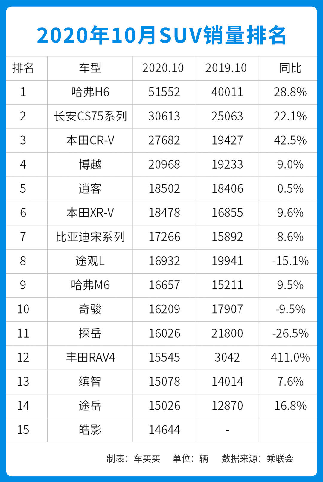 在10月的TOP15榜中,皓影和途岳成为了新入榜的成员,而奔驰GLC和荣威RX5则不幸掉队。