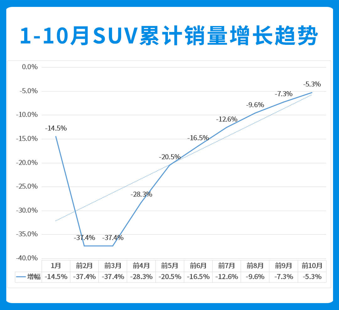 SUV无疑是推动车市增长的最强动力,虽然1-10月累计销量“只有”690.3万辆,较去年同期仍有5.3%的下滑,但按照目前的趋势来看,到了12月份,SUV累计销量增长有望转负为正。