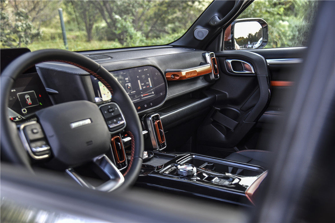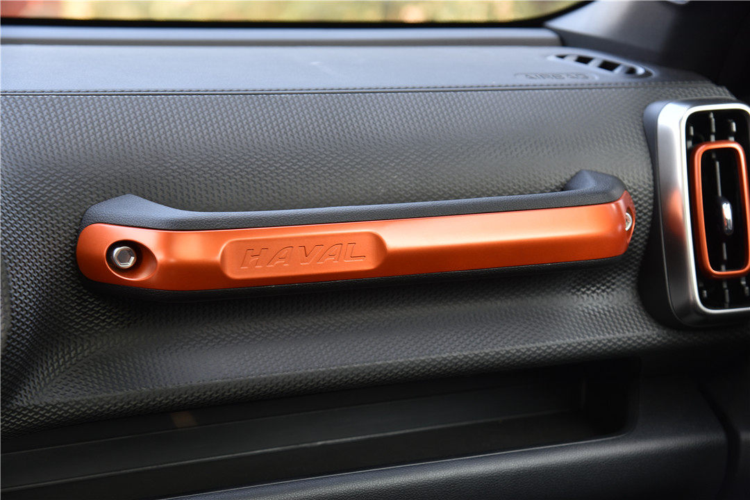 同时作为越野车,越野的元素融入自然也不能少,其中最明显的莫过于在A柱、B柱上方加装了扶手,同时副驾驶上的扶手还加入了裸露的铆钉设计,“野味”十足。并且在副驾中控扶手、中央扶手箱、空调出风口以及前后排座椅上,都支持与车身采取相同颜色的拼色设计,大大增强了车型个性化定制能力。