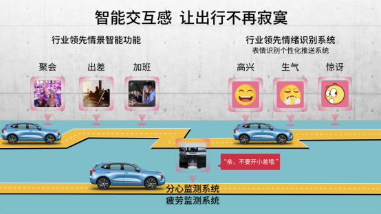 哈弗初恋能够根据旅途中不同的温度,不同的路况和不同的时间,主动地提醒开关车窗、开空调、座椅通风加热等。比如年轻人在赶去聚会的路上,系统会根据路况判定道路是否拥挤,如果是拥堵,人肯定会焦躁,系统就会主动推送相声,缓解一下焦虑;或者车主驾驶初恋去别的城市玩或者出差,当在12点或19点前连续行驶了2个小时的时候,系统就会主动推荐当时地理位置周围的餐厅,省去了自己搜索的过程,省时省力还能吃到美味等等。