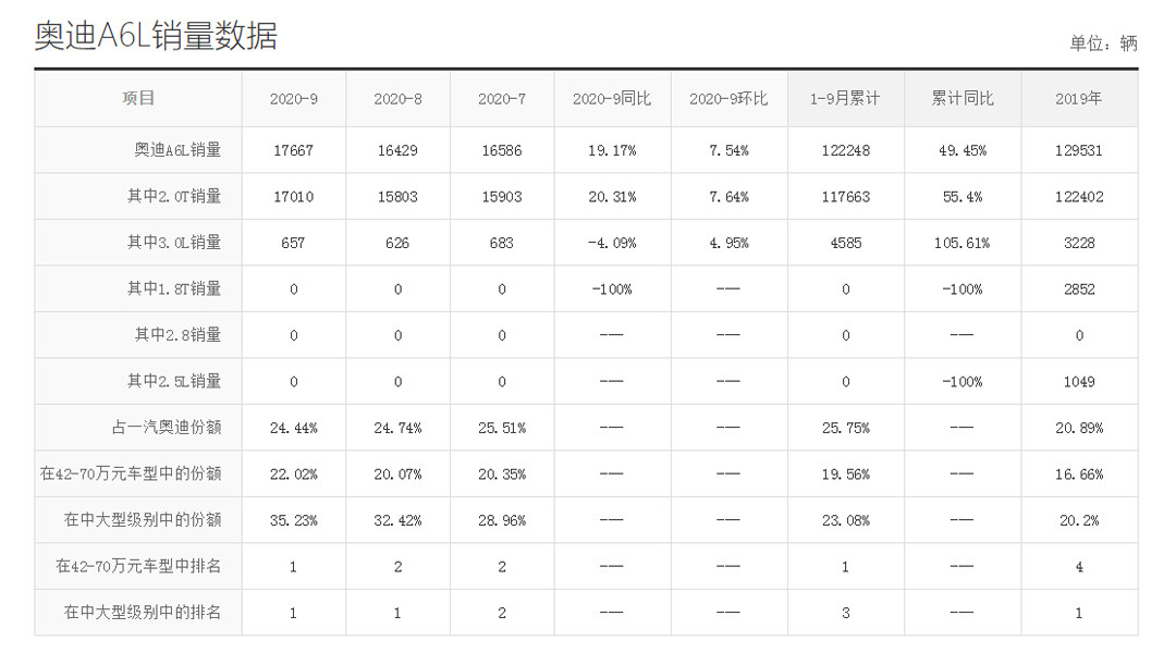 作为豪华商务定位的轿车,奥迪A6L同时也搭载了一台定位更高的进口3.0T V6发动机,不过消费者根本不买账。以2020年9月的数据来看,A6L总销量为17667辆,其中2.0T版本售出了17010辆,而3.0T版本仅有可怜的657辆。说明即便是在豪车领域,大部分消费者还是不愿意为动力花费更多的预算。