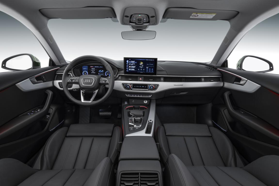 奥迪A5 整体内饰布局依旧延续现款车型的座舱氛围。全系标配多功能三幅方向盘。仪表显示提供经典、运动、动态三种显示模式。中控布局采用亮银色镀铬与贯穿式出风口的搭配,仪表与中控屏幕采用双液晶屏幕的组合。整个座舱把科技时尚的氛围交代得明明白白。
