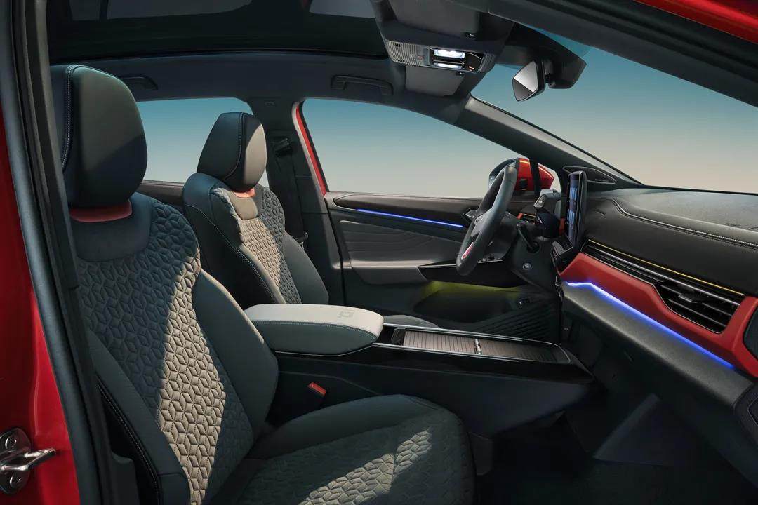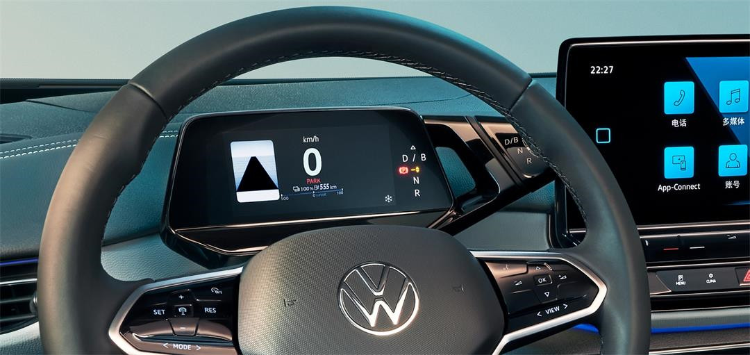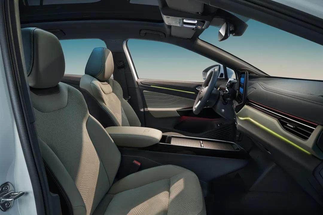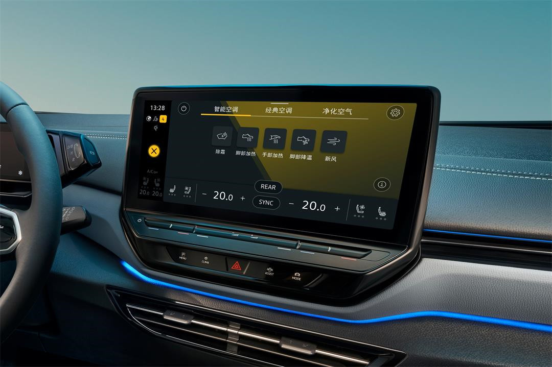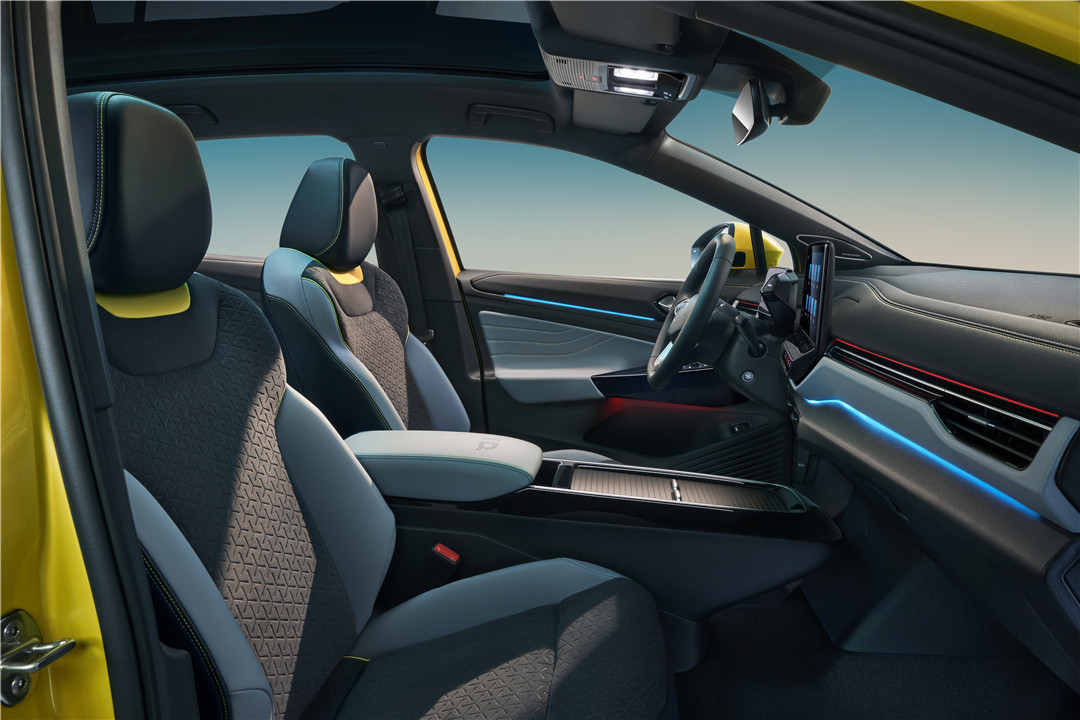 在外观与内部利用光与色彩完成了初步的整车视觉渲染后,ID.4 X 光荷4 X在车内也下了不少功夫。在灯光的氛围渲染中,再利用超越了传统的功能设计,以及全新的人机交互体验,极大增强自己的科技感。
