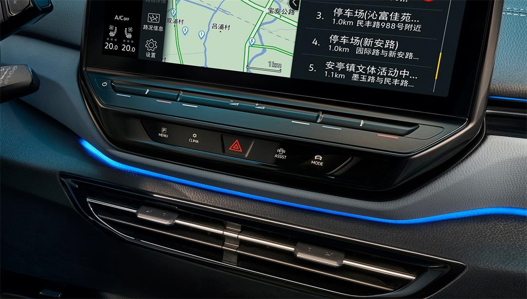 ID.4 X 光荷4 X的光的元素并不仅仅集中在外观上,车内部分配置也基于灯光效果进行实现的。例如一套全新的ID.Light光语系统,通过仪表台前方一条贯穿式灯带,在导航指示转弯、变道等情况下以蓝色灯光效果做出提示,并且低电量、有碰撞危险时显示红光警示驾驶员,对于很多夜间或是光线急剧变化的隧道环境,人眼的适应性远远不如雷达迅速,通过挡风玻璃下的ID.Light光语系统提示驾驶员前方突发应急情况,要比驾驶员自己察觉并做出反应迅速0.5~1秒的时间。除此之外,支持颜色调节的车内氛围灯、迎宾系统等也展现出了灯光于车内环境上的应用。