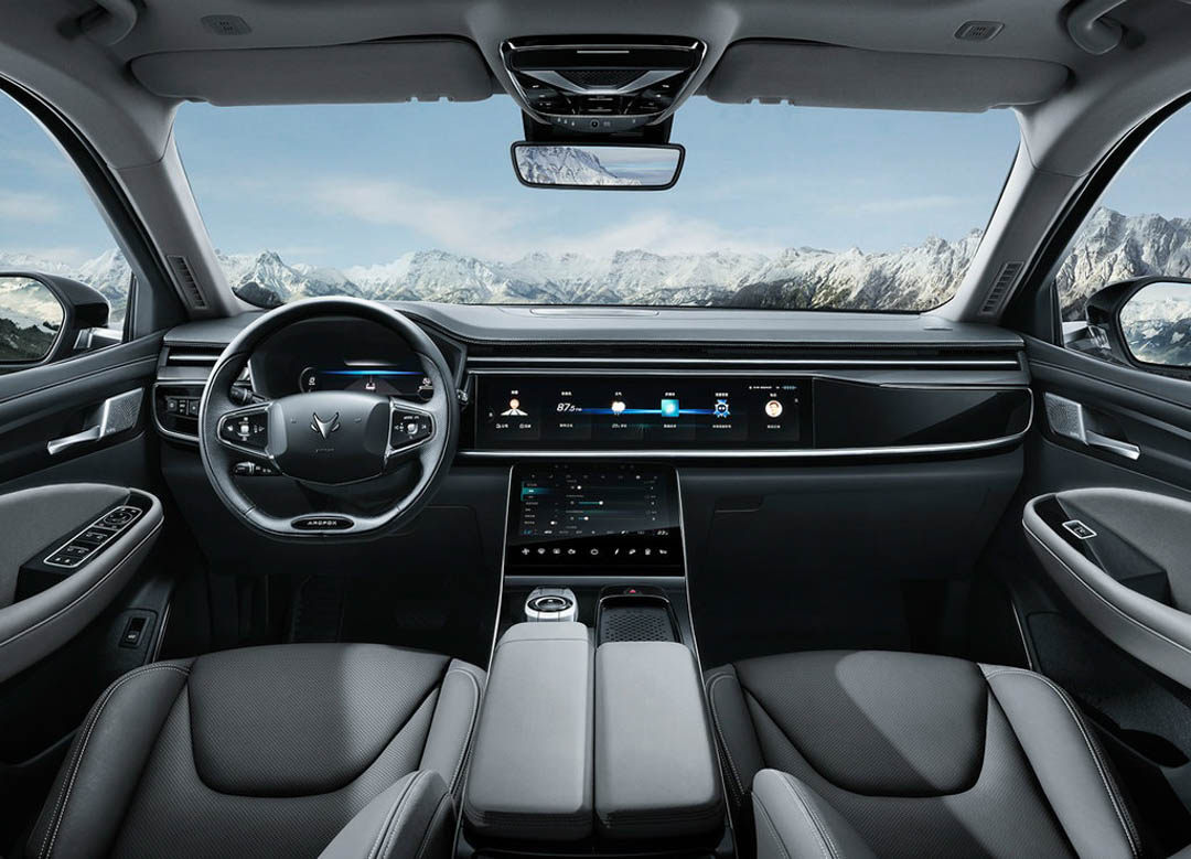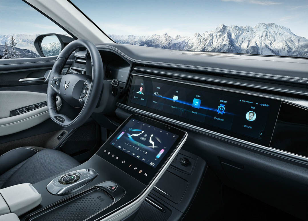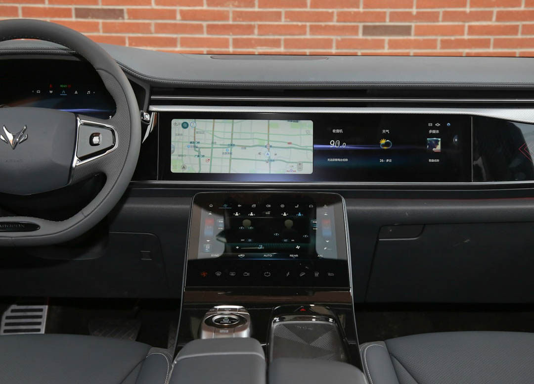 这套夸张的屏幕系统由20.3寸中控屏、10.1寸触控屏、8寸风挡HUD和12.3寸全液晶仪表盘组成,并且这四块屏幕可以互相协同工作。