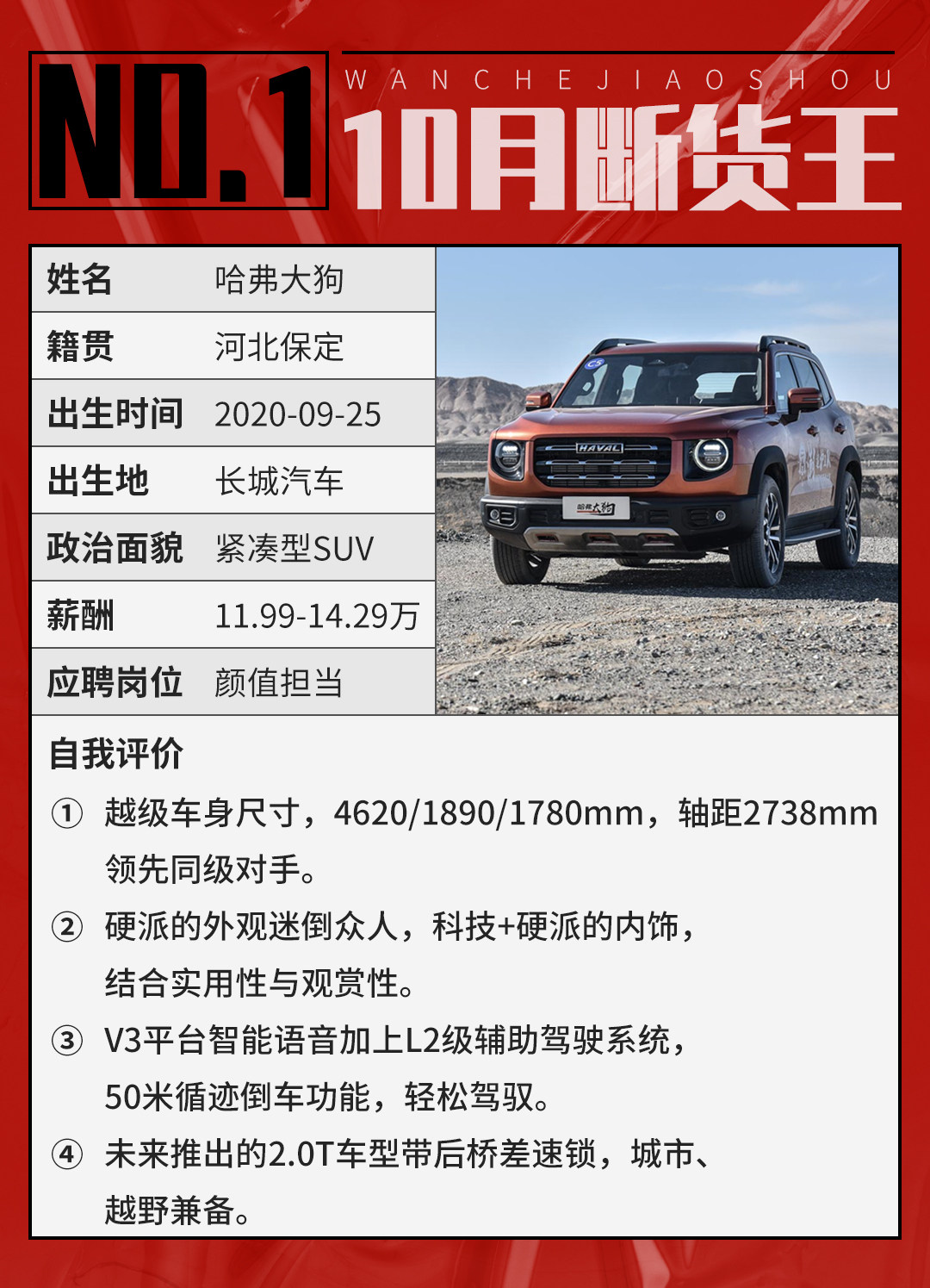 虽然叫哈弗大狗,但我真的不狗。哈弗大狗在9月上市,10月就收获了7013辆销量的好成绩,再加上9月上市之后的订单,上市不到两个月销量就突破了1万辆。