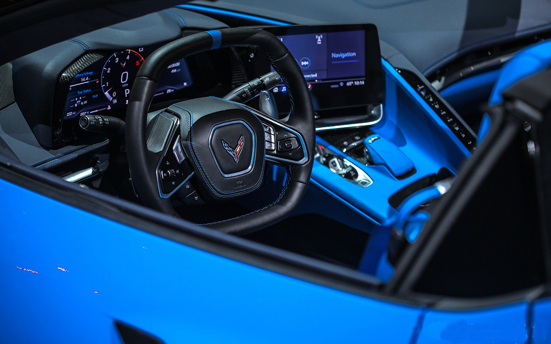 采用硬顶敞篷结构的侧面,还运用隐藏式门把手设计,科幻感很足;而内饰部分,科尔维特C8设计成环抱式座舱,右侧面板集成了大部分按键,并且呈一字型排开,实际操作可能并不那么方便,不过车内同样配备跟得上时代的大尺寸连屏设计,极大提升车内的科技感。