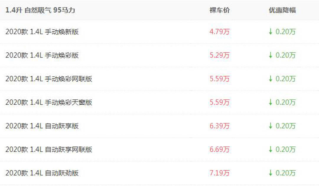 动力方面,瑞纳全系均搭载一台1.4L四缸发动机,最大功率95马力,而变速箱方面则根据不同的配置分别搭载5MT和4AT两款变速箱。