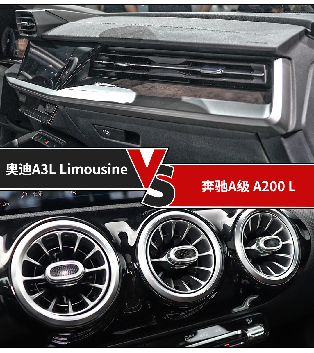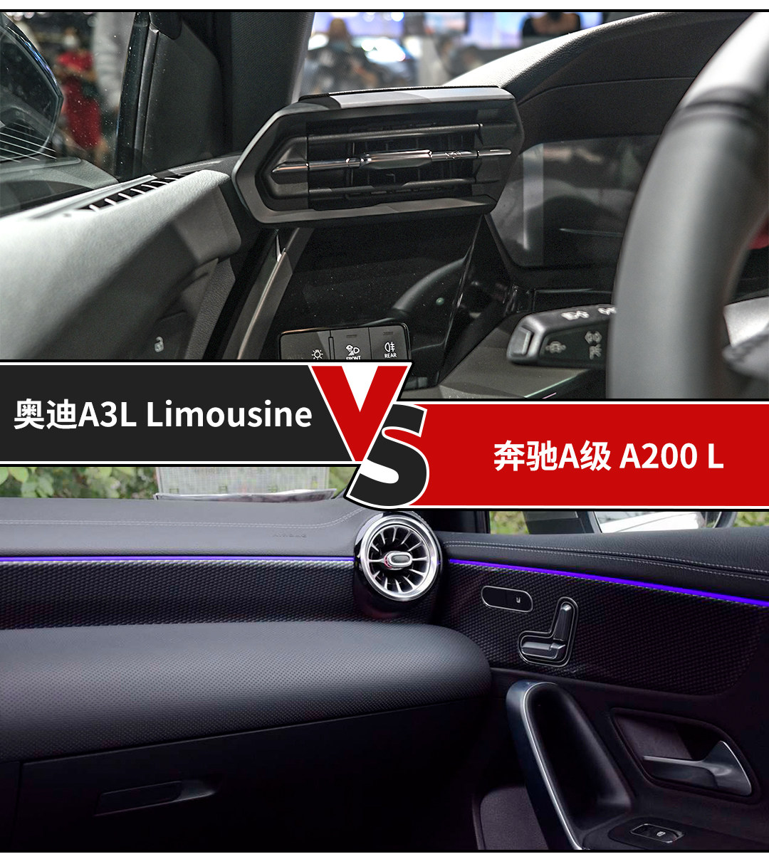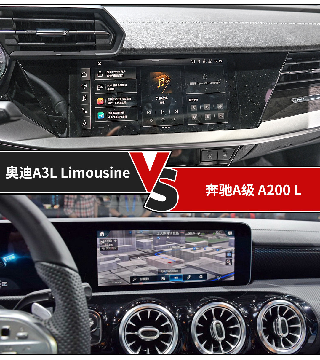 新款A3L的中控屏取消了悬浮设计,改为嵌入式,12.3英寸屏幕更有科技感,按键分布非常规整,整个车厢氛围很简洁;不过更简洁的是奔驰A级,按键设置更少,按键占用空间更少。