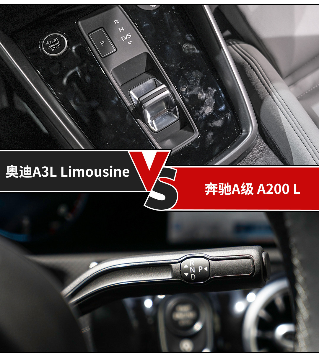 两家品牌都简化了换挡结构,奔驰A级的换挡式换挡是传统,而新款A3L则是换成了上下拨动的按键式换挡,跟保时捷911、高尔夫类似,换挡结构周围就可以腾出很多空间。