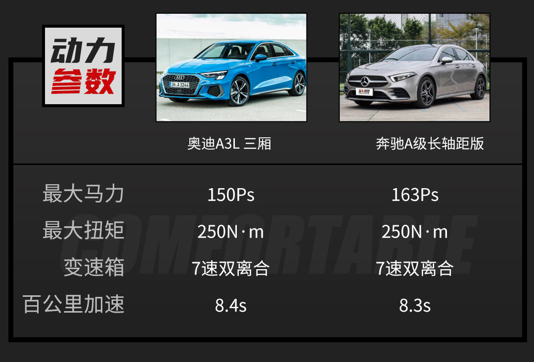 而奔驰A级全系采用1.3T涡轮增压发动机,分高低功率调校,分别有136Ps和163Ps,最大扭矩分别是200N·m和250N·m,整体的参数表现跟A3差不多,匹配的也是7速湿式双离合。
