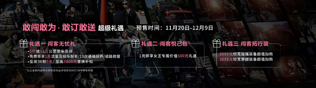 作为展台重头戏,基于“坦克·WEY”全球智能专业越野平台打造的坦克300,正式开启万众期待的“预售模式”。触手可及的价格,使得这一“全民爆款”成为WEY加速革新的全新引擎。与此同时,WEY更是送上一份预售攻略,为包括共创官在内的无数“闯客”,送上5年免费尊享流量及娱乐服务、10次基础保养等多重预售专属礼遇,助力越野达人、都市先锋、时尚女性等更多用户达成心中所想,闯出人生新边界。
