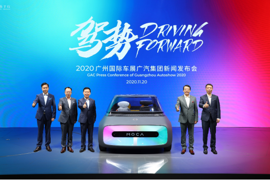 广汽集团董事长曾庆洪(左三)、广汽集团总经理冯兴亚(右二)、广汽乘用车总经理张跃赛(左二)、广汽研究院院长吴坚(右一)、广汽埃安总经理古惠南(左一)与概念车摩卡MOCA合影