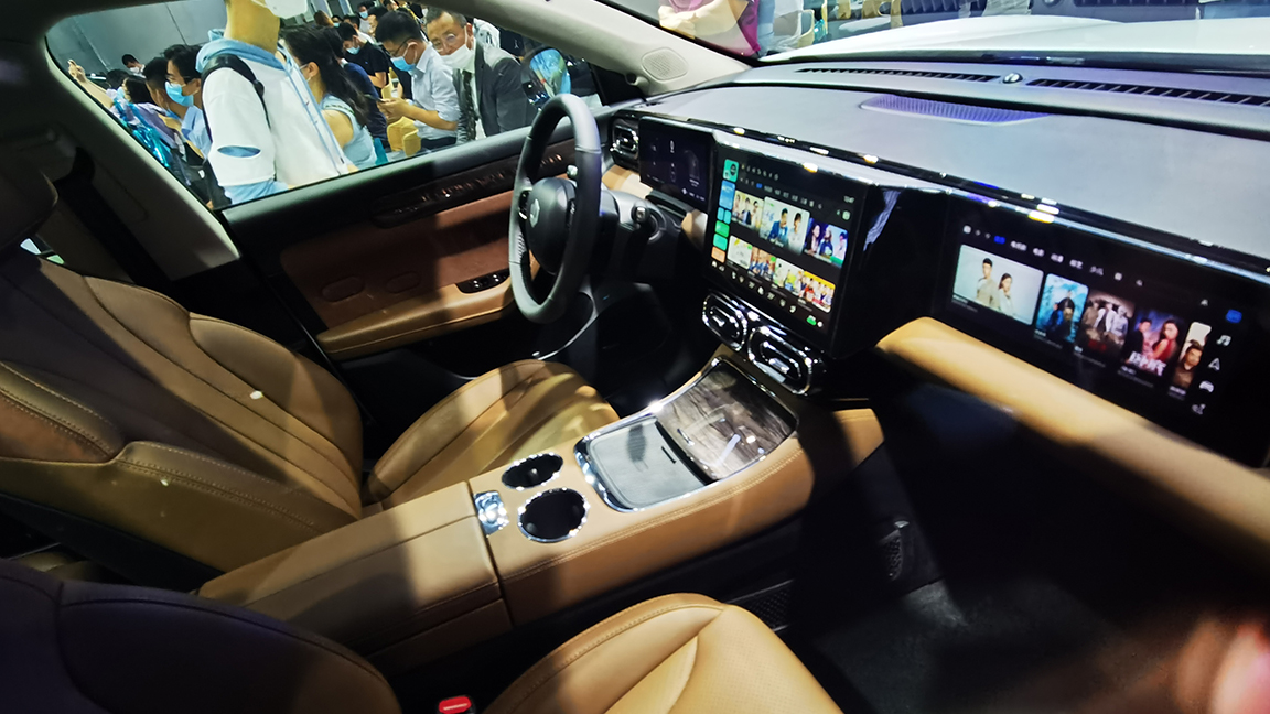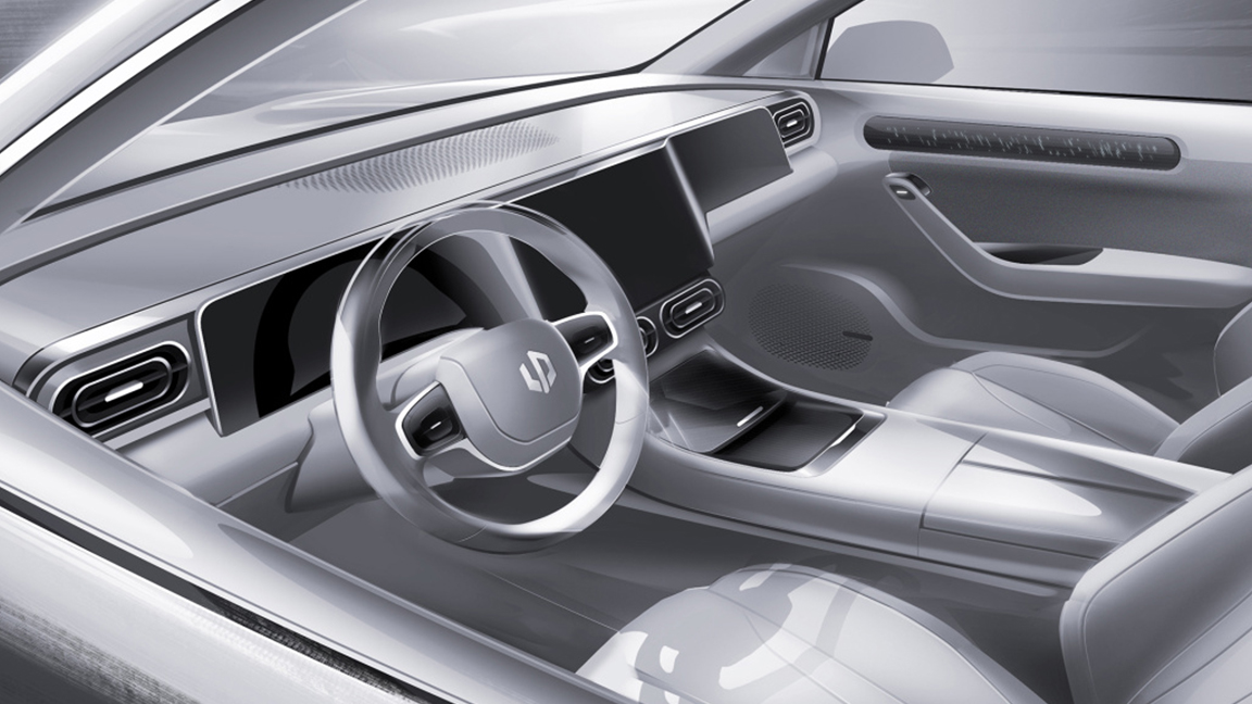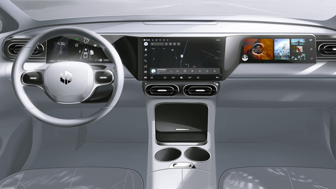 比较遗憾,这次车展上零跑还未正式开放内饰,所以目前仅能参考设计草图和部分实拍图。从最新的设计图来看,零跑C11使用了大量园矩形元素,例如最明显的空调出风口造型等。而车内最突出的莫过于三联屏设计,其分别为仪表盘(10英寸)、中控屏(13英寸)、副驾前方显示屏(10英寸),科技感特别强。