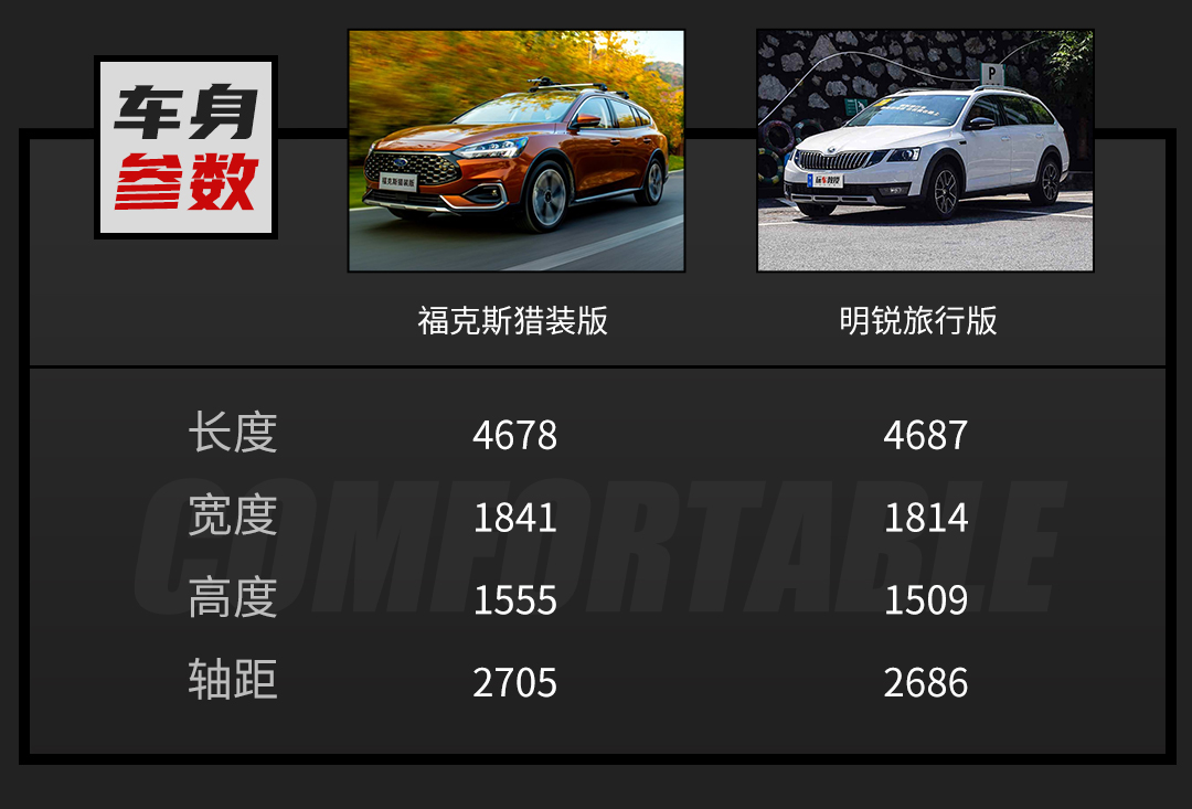 尺寸方面,新车长宽高分别为4678/1841/1555mm,轴距为2705mm,与国产现款福克斯(两厢)相比,虽然旅行版的轴距与其一致,不过更长的车身绝对能带来更充裕的后备箱储物空间。其次,从定位来看福克斯猎装版的最直接竞品或是明锐旅行版,两者均定位紧凑型合资旅行车,尺寸上两车差异不大,轴距则是福克斯猎装版占优。
