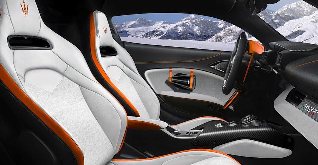 从官方发布的图片来看,玛莎拉蒂MC20配备了带钢钉的雪地胎,并且在发动机罩上配备了滑雪板收纳架。MC20概念车的车身搭载的是来自Nettuno V6发动机,该发动机最大马力为621Ps,最大功率则是463kW,峰值扭矩达到729N·m,传动方面与之搭配的是8挡双离合变速箱。