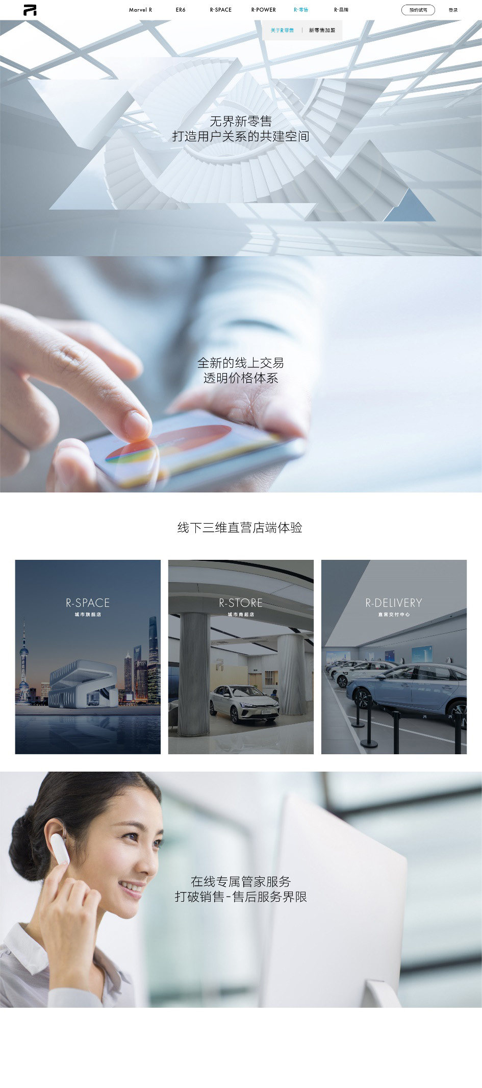 本次独立官网的上线,以更加直观的方式展示了R汽车品牌的产品、渠道及服务,方便用户朋友更全面地了解上汽R汽车。在线咨询、下定,给您一站式的服务体验。