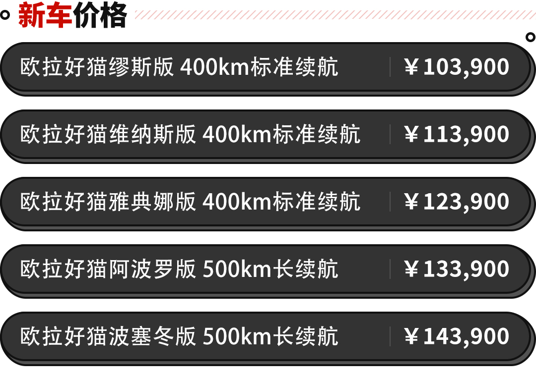 继黑猫和白猫之后,欧拉好猫的到来也终于凑齐了那句经典话——不管是黑猫还是白猫,能抓老鼠的就是好猫!就在11月24日晚,欧拉旗下全新纯电小型SUV——好猫正式上市,新车补贴后售价区间为10.39-14.39万元,共推出了5款车型。