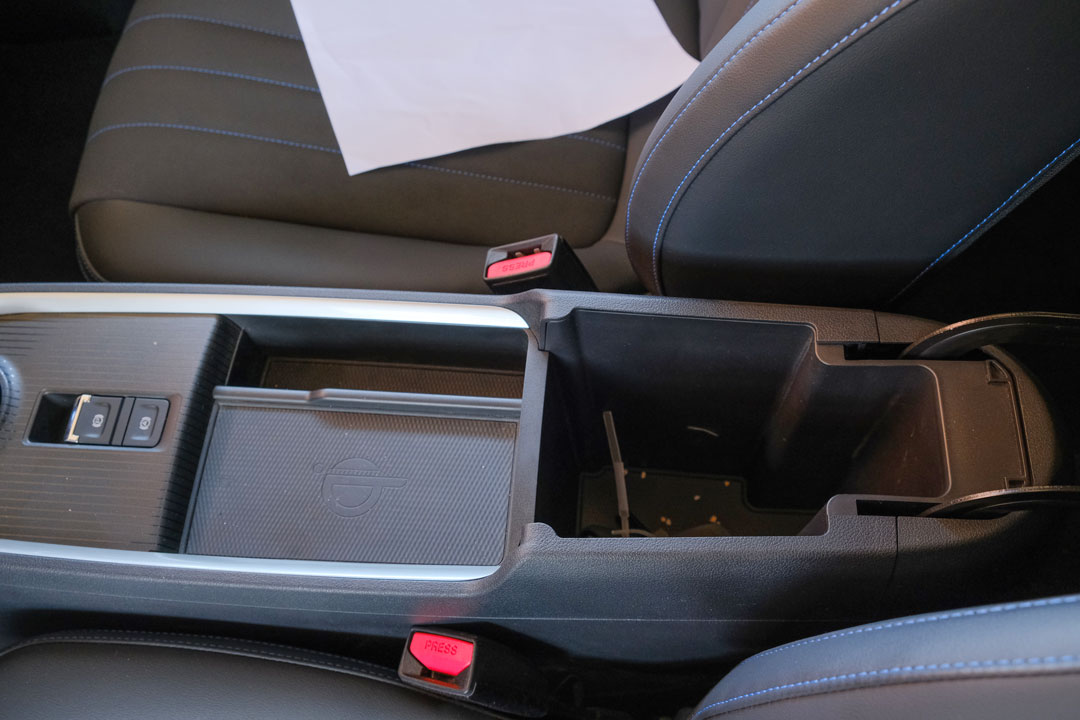 值得一说,在换挡机构后方除了电子手刹和自动启动两个按键,还有两个便于放置手机的储物格,对于前排乘客来说是个好消息。