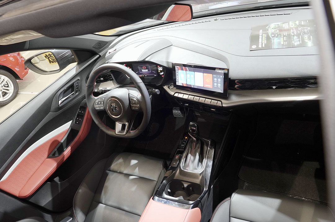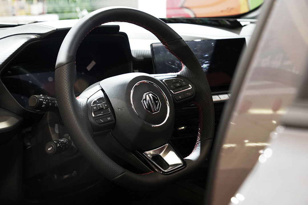 方向盘依然是我们熟悉的MG的样子,平底式设计的方向盘握感厚实,且上面有多功能按键方便驾驶的时候操作,同时红色的缝线有助于提升整体的质感,换挡拨片的加入更是给了喜欢驾驶的朋友更多的操控乐趣,这在十万元以内的车型里还是比较少见的。