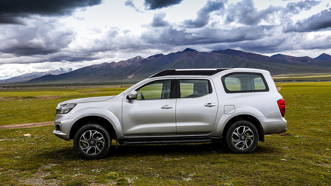 说起来,这台帕拉索是皮卡锐骐的乘用车版本,所以在外观上,帕拉索还保持着一些现款锐骐6的设计元素,因此车身线条也较为直来直去,走的正是越野粗犷的风格,前脸多边形中网四周的镀铬装饰也比较粗壮,一看就非常硬朗。值得一提的是,这台东风日产帕拉索悬挂的车标是东风车标。当然相比锐骐6,帕拉索最大的变化是将货厢改为SUV式的封闭高顶货厢。车身尺寸方面,相比普通版锐骐6在高度上增加明显,新车长宽高分别为5227*1864*1989mm,轴距则达到3150mm。