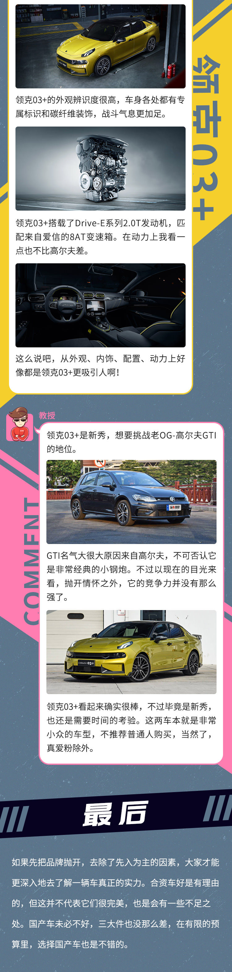 高尔夫GTI估计很难以超越他的成就,就更别说是咱们的国产品牌了,虽然在某种意义上我们不得不承认领克03+的出色发挥,作为后起之秀也代表着自主品牌更高的一次跳跃,只是在这个品牌的原因之上大众毕竟是要更高于他。