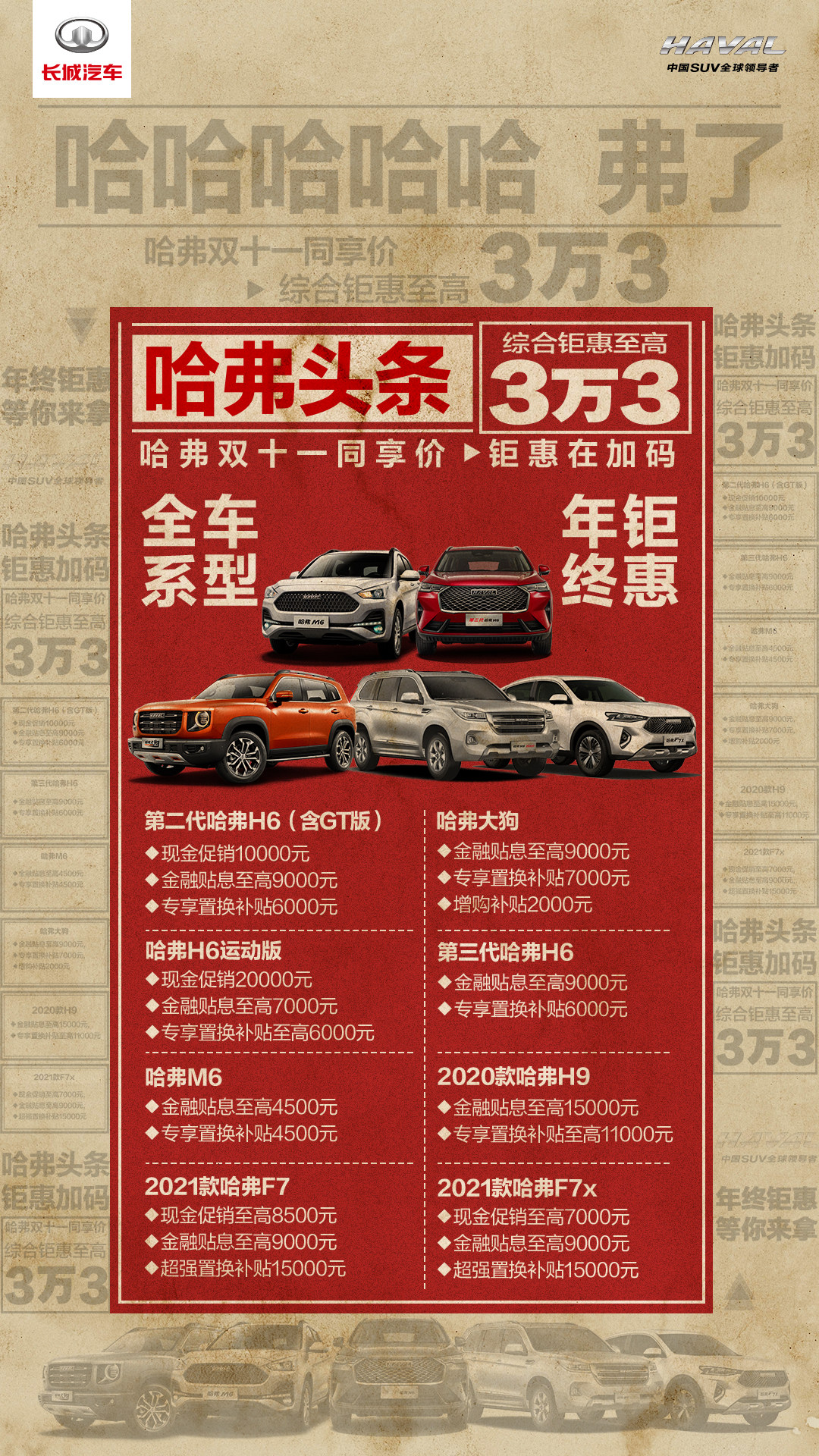 哈弗品牌就是“中国SUV大学”里的“学霸”,门门功课优秀,专业技能无比扎实,并且还有高颜值、高内涵,自然圈粉无数。双11完结之际,哈弗再启钜惠狂潮,至高优惠3万3、近乎抄底价的大幅让利举措,每一个心仪哈弗SUV的准用户当然不会无动于衷。不过,“五哈”集结,各显身手,各有千秋,当心不要挑花眼才是哦。赶紧行动起来,锁定你心中的那一辆Dream Car吧。