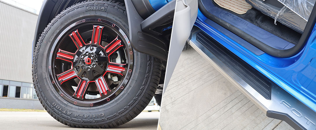 为了方便乘客上下车,车身侧面还配置了踏板。红色的多辐式轮毂看上去很是招摇,配备了佳通4×4 AT100轮胎,规格为265/60 R18。