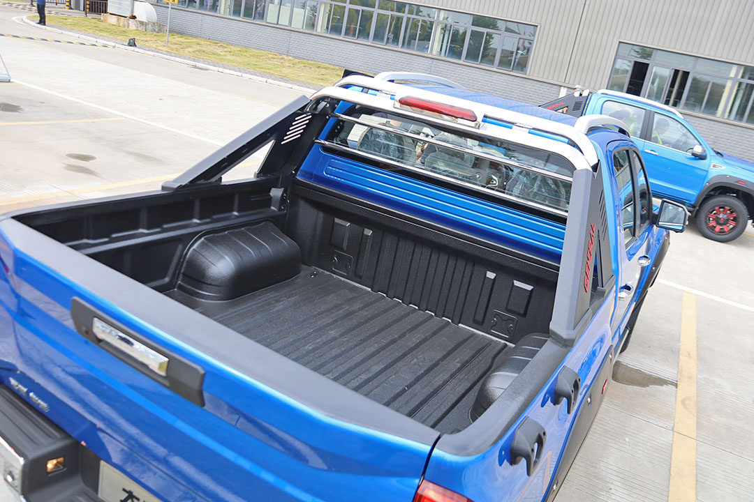 侧面的造型同样霸气,黑色的轮眉向外凸起,显得野味十足;硕大的外后视镜采用了镀铬装饰,看上去精致了不少;而车顶行李架和粗壮的防翻滚架,则是硬派皮卡的标志性象征。
