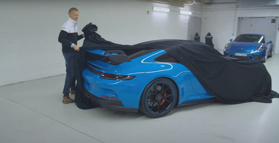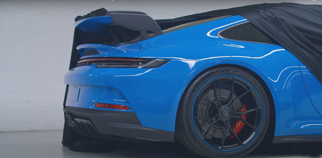 从节目的视频截图中来看,新车的车头在引擎盖头部加入了两道通风口;前杠底部带有一体式进气口,并且两侧集成了小尺寸的LED日行灯和导风槽。侧面可以看出带有中央锁止轻量化轮圈,轮毂内部配备了PCCB碳陶瓷打孔盘和红色刹车卡钳;尾部最大的亮点在于固定式尾翼,并且同样以经典的鹅颈式造型固定在尾盖上。车尾的扩散器造型也和前脸相呼应,中置双出的排气是对前代车型的一种传承。