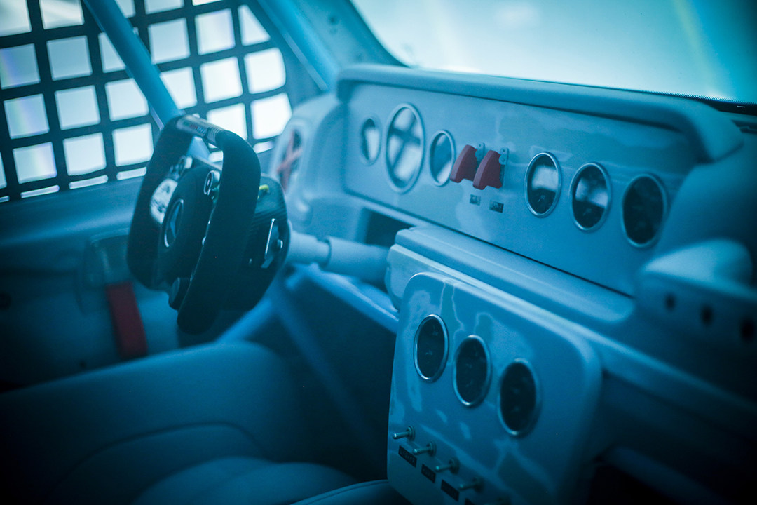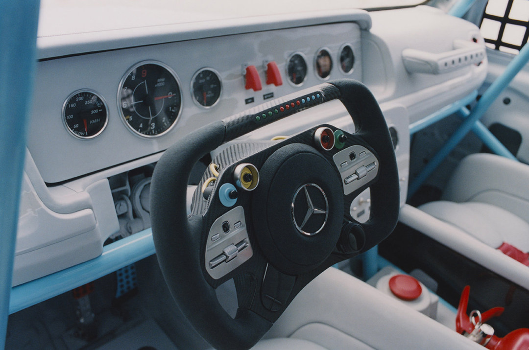 内饰同样大面积采用白色涂装,但是防滚架和备用油箱为淡蓝色,安全带、车门拉环以及一些开关则改为亮眼的鲜红色。同时该车的门板和内饰部件全部掏空,并标配AMG ONE同款方向盘、赛规仪表和拨杆开关,再加上DTM规格的桶式座椅,展现出更为纯粹的速度与性能。