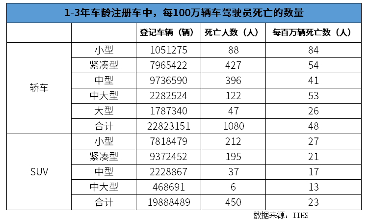 另外我们从上面这份表还可以看到,无论轿车还是SUV,尺寸大的车一般会比尺寸小的车死亡数更低。比如微型轿车的每百万死亡数为84,而大型轿车为26;小型SUV每百万死亡数为27,而大型SUV为17。