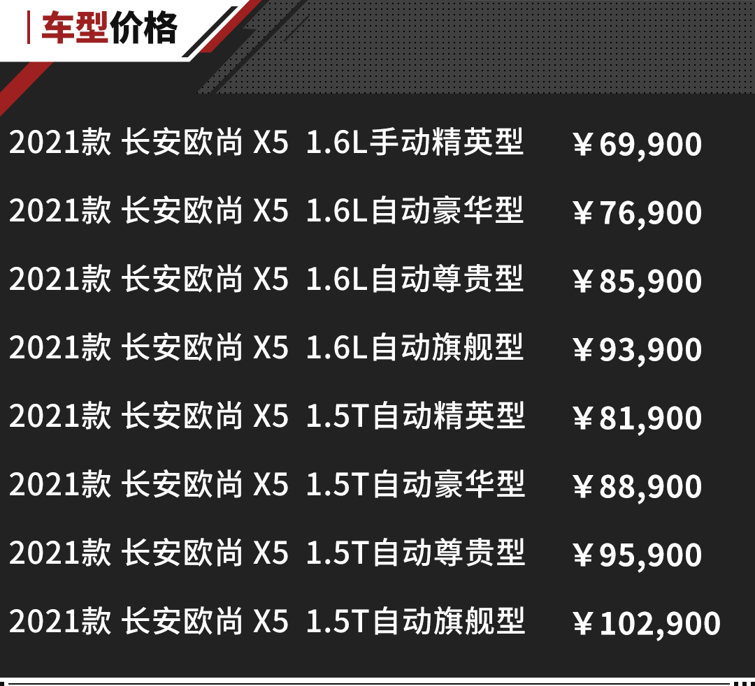 长安欧尚X5定位运动个性化SUV,主打十万级别紧凑SUV市场,面向年轻一代用户群体,不论是外观造型设计还是车辆配置上都迎合年轻用户的消费需求。顶配指导售价十万出头的定价意味着拥有长安欧尚的门槛并不高,是一台适合年轻用户入手第一台车的车型。