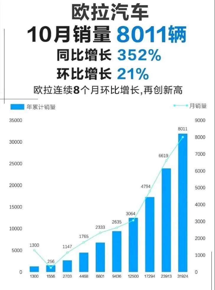 2020年10月,欧拉品牌单月销售了8011台新车,凭借黑猫和白猫的吸引力,一举拉高品牌创新高的成绩,同比增长352%,并连续10个月销量环比增长,成为全国BEV销量TOP5的品牌,进入新能源第一阵营。难能可贵的是,欧拉作为一家成立仅两年多的电动汽车品牌,诞生之初就坚持做100%原生纯电动车,并拒绝“油改电”和“补贴车”,坚定走精品电动路线,选择亲民的方向,满足城市内出行需求,并做到好开好用。很显然,欧拉精准的品牌定位和合适的产品投放赢得了用户的认可,也因此成为了国民眼中的精品好车。3年前,电动车还是售价高、可靠性低、续航短、出行辐射范围小的新能源产品;2年前,小型电动车更是工业废料、与性价比无关、高额骗补的政策性产品。此时,欧拉作为立志成为中国MINI和Smart的精品纯电品牌,在成立之初就拒绝“油改电”和“补贴车”的路线。全新的猫系品牌定位、全创新的潮玩营销打法、专属的“喵星人”身份认同、加之强大的产品实力, “猫力觉醒”的时代正在开启,8连涨仅仅是个开始,欧拉的未来值得期待。