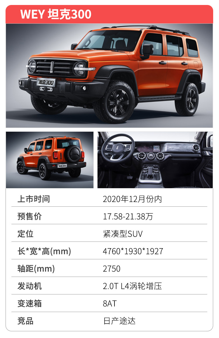 瞄准了国内的豪华硬派SUV,WEY推出了坦克300车型,外观有着几分JEEP牧马人的感觉,不同的是它更为豪华精致,有着LED光源的前大灯尾灯,内饰用料也颇为高级。更重要的是,这是一款紧凑型级别的硬派SUV,不仅能有效控制价格,也能有相对于更大尺寸车型更佳的操控感受。性能方面,坦克300搭载了227马力的2.0T发动机,匹配来自ZF的8AT变速箱,四驱形式为分时四驱,并且具备前后差速锁,越野性能达到同级优秀水平。视乎其顶配也不过21.38万的售价,真香~