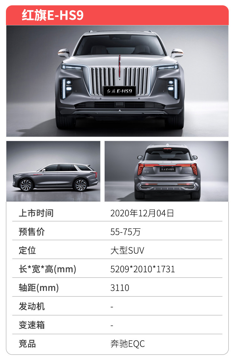 作为红旗纯电旗舰SUV,新车整体非常霸气,毕竟这是一款车身尺寸达到5209*2010*1731mm,轴距达到3110mm的大型SUV。加上巨大的“进气格栅”,协调的比例,颇有一种“中国库里南”的感觉,威武而不失动感。动力方面,则是全系采用双电机,根据版本不同最大功率分别为320千瓦以及405千瓦,能够实现6.5秒/5秒的破百时间,续航则是400km/500km,整体表现与BBA的纯电SUV相比,甚至还处于上风,更别说体态方面,红旗E-HS9有压倒性优势。