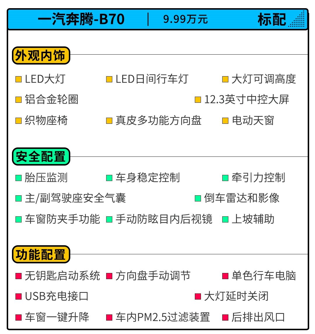 丰富的配置也是奔腾B70的一大亮点,首先在外观方面标配了LED大灯、LED日间行车灯、铝合金轮圈,其次是内饰方面标配了12.3英寸大屏、电动天窗、真皮多功能方向盘,外观和内饰这些配置都是消费者购车最直观、最容易感受到的。