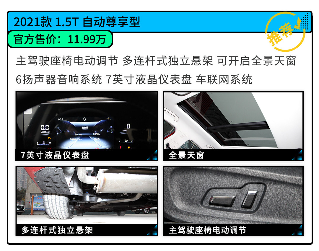 而其中最值得推荐购买的就是指导价为11.99万元的1.5T自动尊贵型,对比低配车型,重要的变化主要有几个地方,首先是座椅从手动调节升级到了电动调节并带有加热功能,其次是配备了7英寸的液晶仪表盘,最后是后悬架从扭力梁升级为多连杆,这几点都使得这两万元差价花的极为划算。