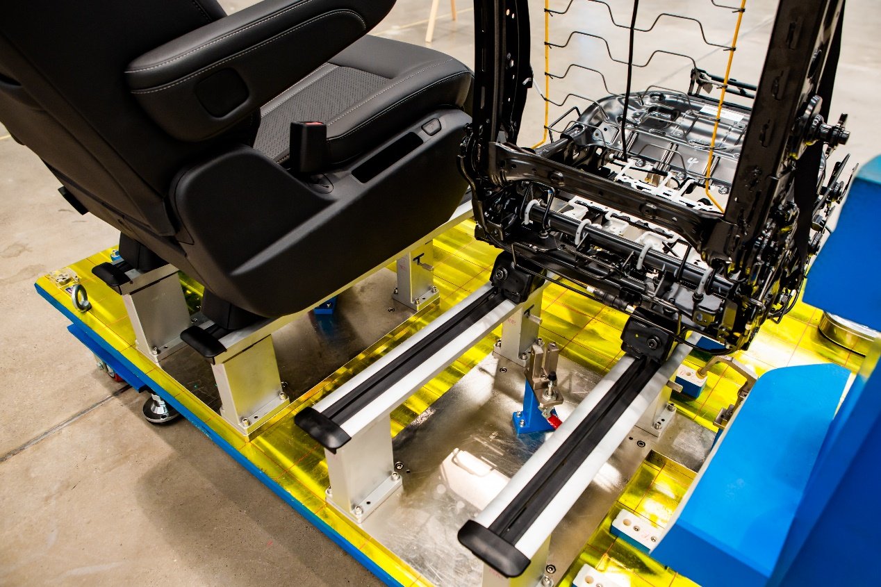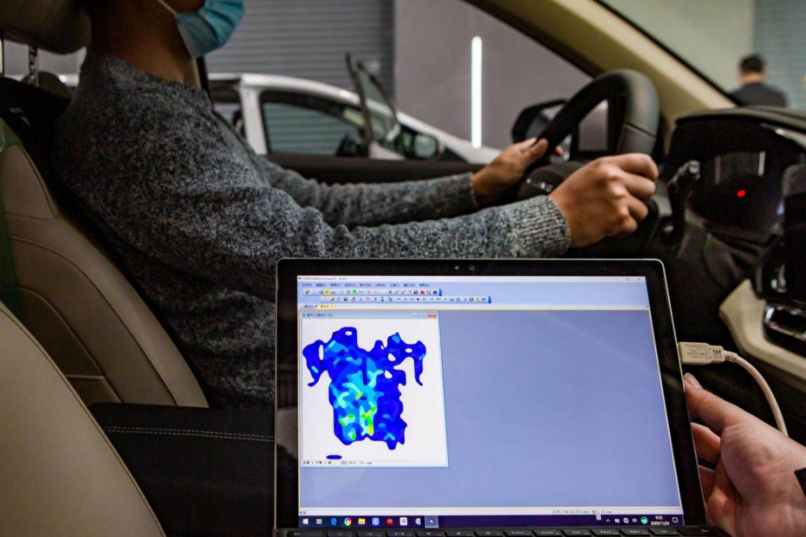 除了安全性相关的试验外,五菱凯捷座椅还需接受体压分布试验等舒适性试验的考验,通过布满压力传感器的感应垫记录人体坐在座椅上各部位的压力值,分析人体与座椅接触的面积和各区域压力的分布,来评价座椅对于人体各部位的包裹性和承托效果。从现场的体压分布试验结果可以看出,凯捷座椅的人体接触面积达到了100,000mm²级别,与摆在旁边的奥德赛相比,无论是实际乘坐体验还说实验数据,都验证了凯捷座椅舒适度确实要比对比车型好上不少。