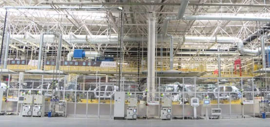 总装车间,拥有全自动风挡/轮胎装配系统、智能工位终端系统,生产节拍可达50JPH,年产能30万台。