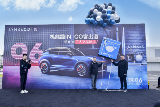 仪式启动环节,领克汽车销售有限公司副总经理陈思英先生为领克06机能新都市公民送上祝福,并和领克汽车区域营销事业四部总监丁宁先生一同开启领克06交付的惊喜时刻。