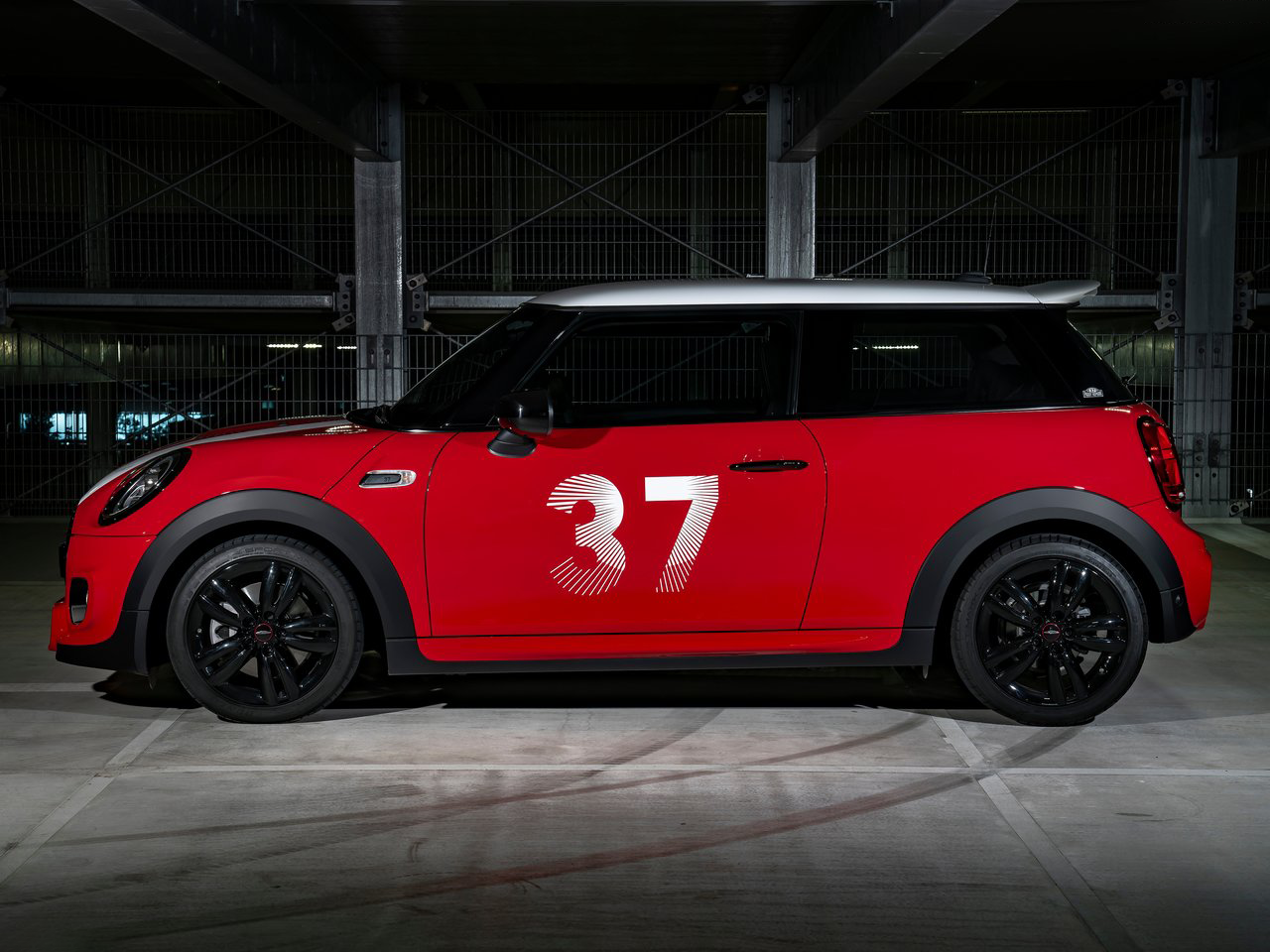 侧面最大的亮点就是“37”号数字的拉花标识,37数字呈现放射式形状以此突显出37号数字在车身侧面的存在感。对于MINI车型来说车窗边框以及后视镜盖经过熏黑处理,营造悬浮式车顶的既视感,但跟以往不同的是,Paddy Hopkirk Edition车型采用白色车顶,与车身黑红双色搭配增添些许的层次感。