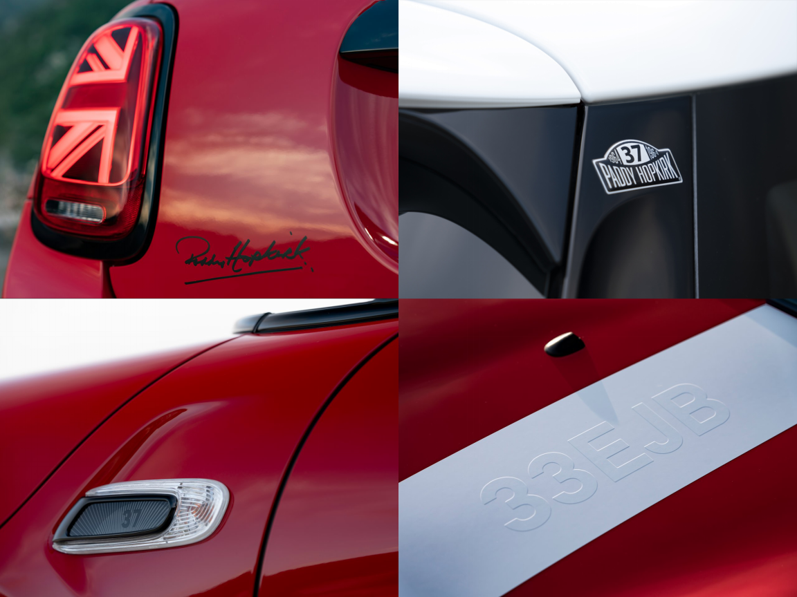 相比于普通版本,Paddy Hopkirk Edition车型在外观造型上采用与原型车同样“辣椒红”车漆涂装配色。新车采用MINI JCW车型同款的运动下包围设计,嵌入中网的照明灯组复刻当时Paddy Hopkirk所驾驶的原型车前脸大灯造型。发动机盖白色拉花暗藏玄机,刻有“Paddy Hopkirk ”亲笔签名字样,与此同时还有原型车注册代号为33 EJB的浮雕样式。